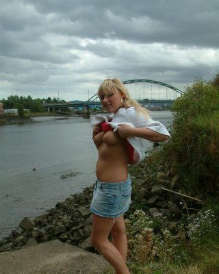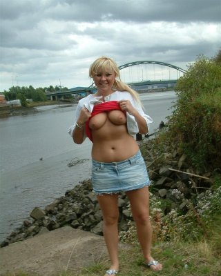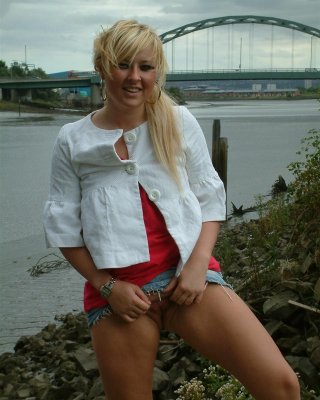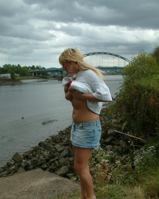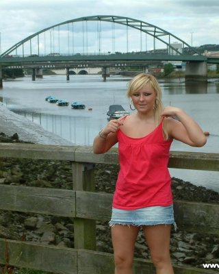 Busty teen blonde flashing and playing with pussy in public by a bridge in the m