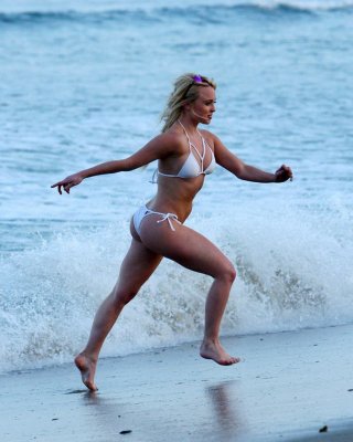 Shauna Sand zeigt ihren tollen Arsch in einem winzigen grünen Bikini am Strand