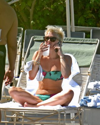 Miley Cyrus trägt Badeanzug und Hotpants an einem Pool in Miami