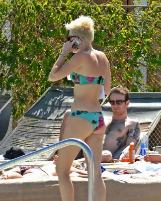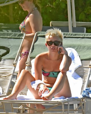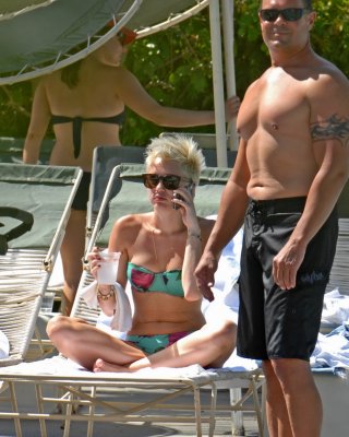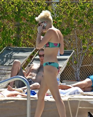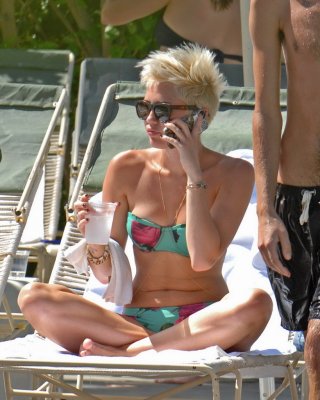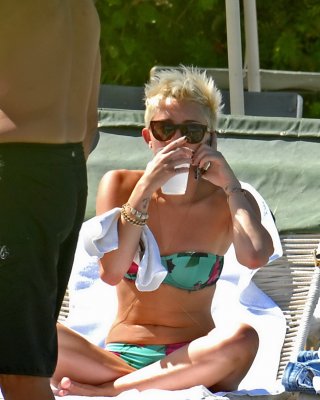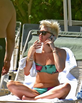 Miley Cyrus trägt einen geblümten Röhrenbikini am Pool des Palm Desert Hotels in Palm Spr