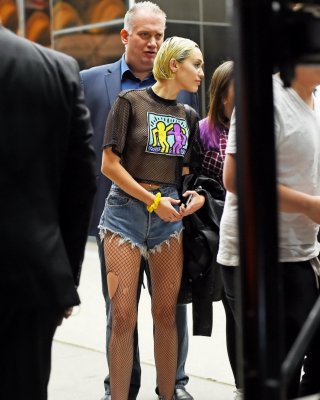 Miley Cyrus zeigt ihre Beine und ihren Arsch in den Denim Shorts und schwarzen Strumpfhosen