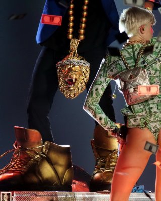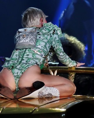 Miley Cyrus zeigt ihren Arsch in einem von Geld inspirierten Trikot während eines Auftritts bei Bang