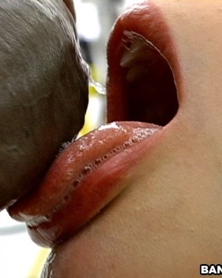 Süße Leckerei tut ihr Bestes, um an einem Monster balck Hahn zu saugen