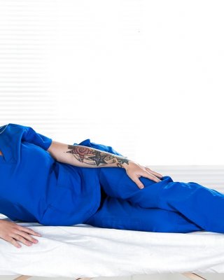 Tätowierte Blondine in Krankenschwester-Uniform zieht sich aus und spreizt ihre Beine
